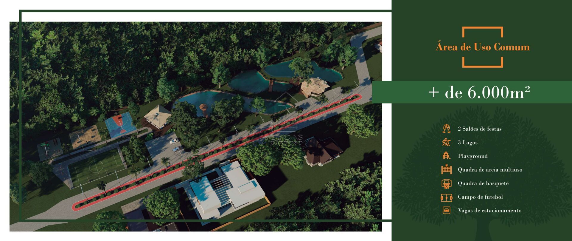 Campo de futebol gramadoCicloviaLagoPlaygroundQuadra de areiaQuiosque ExternoSalão de festas